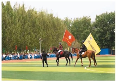 金盾马术俱乐部在河北省三河市第五中学校园文化体育节开幕式上进行马术表演。资料照片